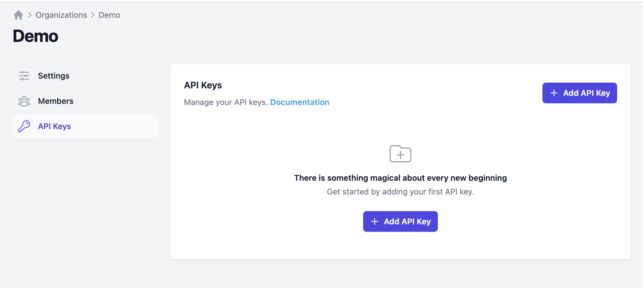 Before you can make requests to the Entropy Data API, you will need to generate an API key for your organization. You can create up to 100 API keys per organization.