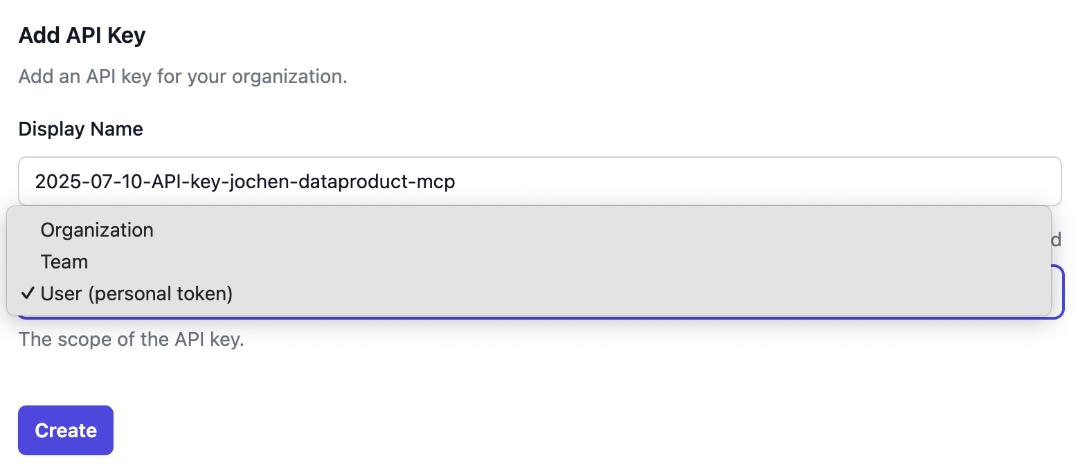 Set the scope of the API to organization, team, or user (personal token), as required. Only organization owners can create organization-scoped API keys.