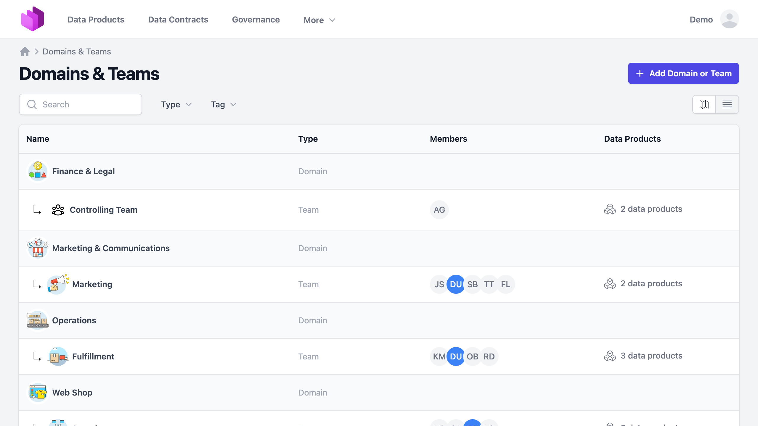 Domains and Teams are fundamental organizational units in the Entropy Data that help structure and manage ownership, access, and governance. They form a hierarchical structure where Domains can contain Teams or subdomains.