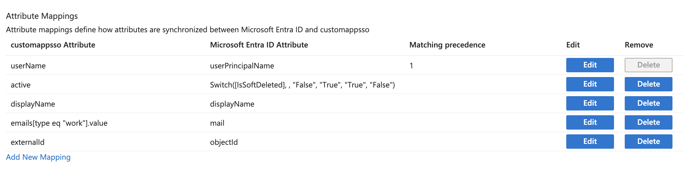 customappsso Attribute | Microsoft Entra ID Attribute | Matching precedence |